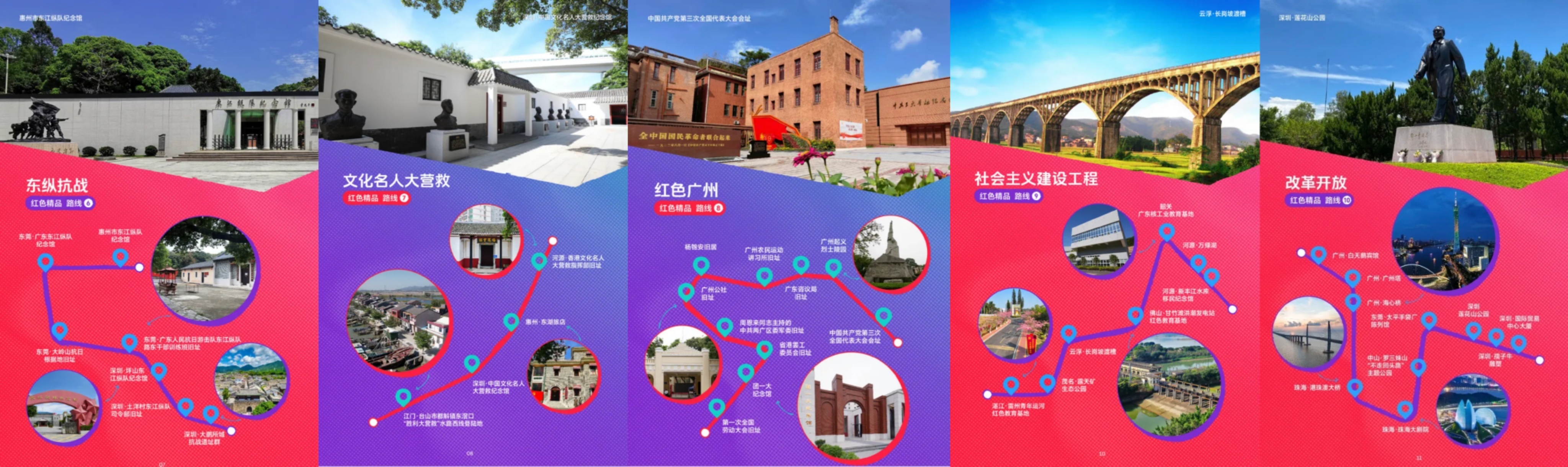 河源(新丰江水库移民纪念馆、万绿湖)—韶关(广东核工业教育基地)—佛山(甘竹滩洪潮发电站红色教育基地)—云浮(长岗坡渡槽)—茂名(露天矿生态公园)—湛江(雷州青年运河红色教育基地)