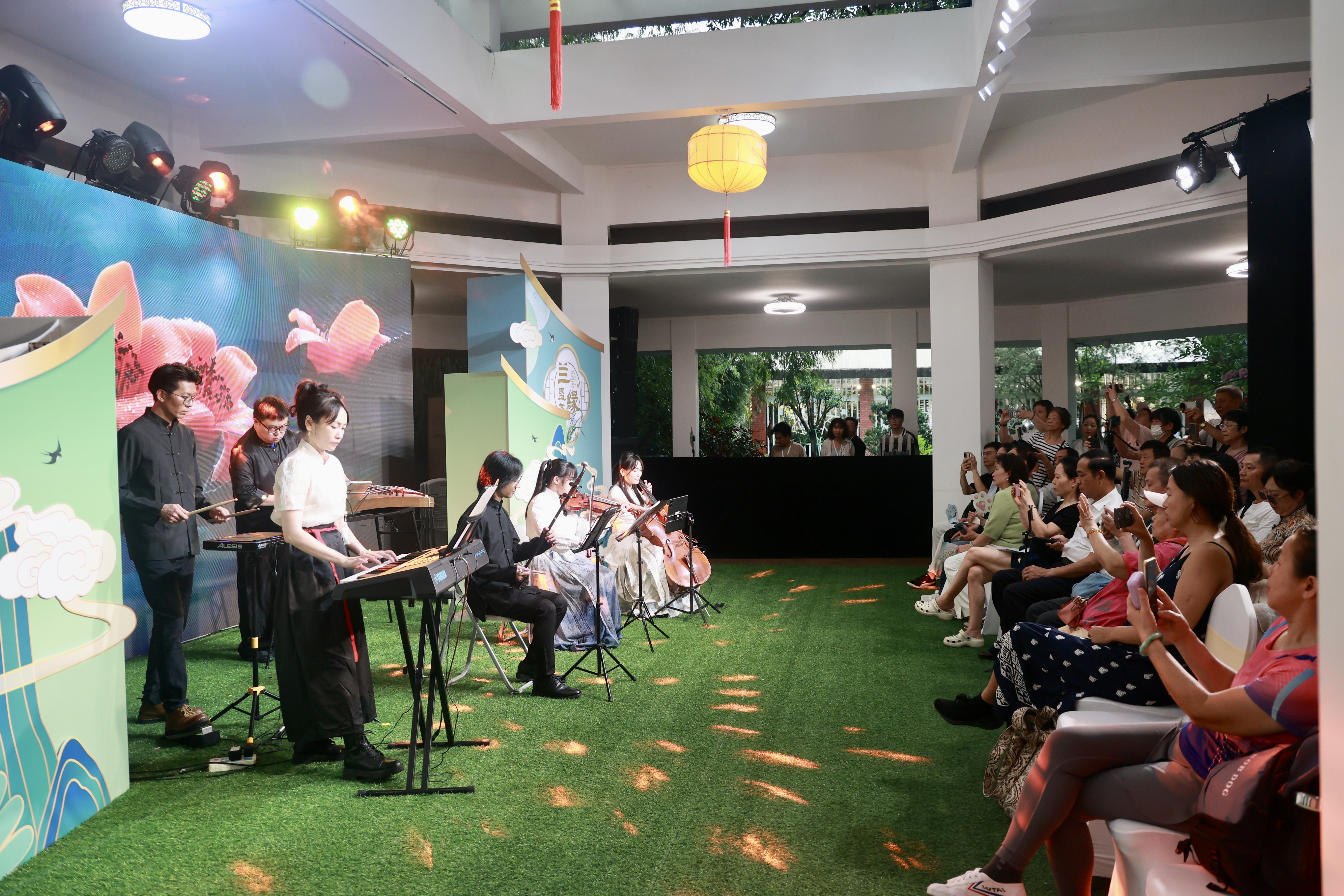 文旅周闭幕当天下午,越秀兰圃路亭内,一场“当传统遇见流行·国潮音乐会”诗意上演。古筝、二胡、椰胡遇上小提琴、大提琴,六重奏打破中西壁垒。一曲岭南《红棉》铿锵开场,《茉莉花》的清新流淌而出,《青花瓷》的婉转在胡琴与大提琴的衬托下勾勒出烟雨江南。最后《稻香》响起,温暖明亮的旋律让观众席里不少人跟着轻轻哼唱。